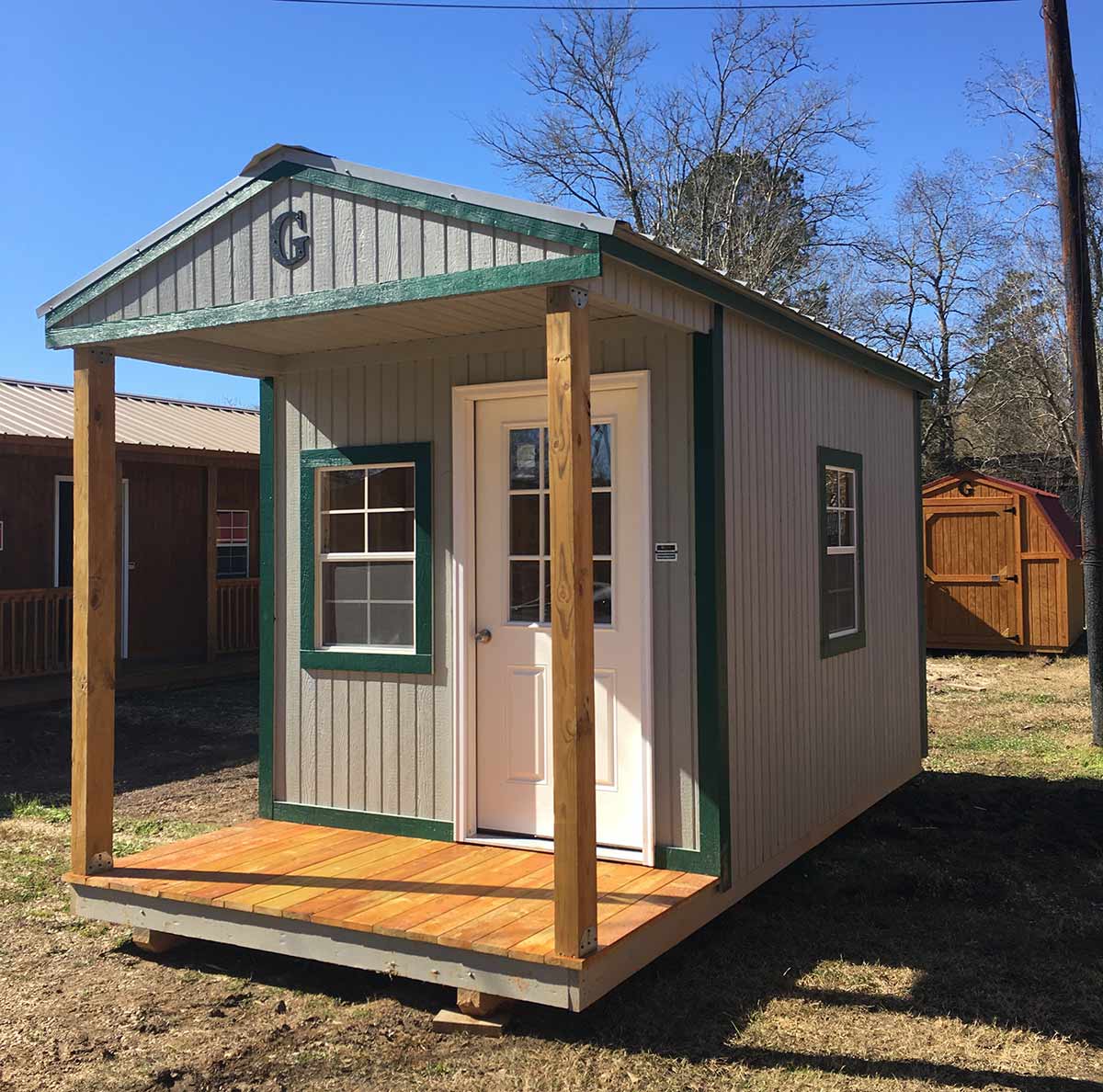 The cabin has all the standard features you’d expect from one of our high-quality portable structures, including sturdy flooring, treated runners and floor joists, reinforced doors, galvanized ring shank nails, and our patented soffit ventilation system that helps with air circulation. It also has a porch that offers plenty of room for gatherings. The cabin is just as stylish as it is functional, even offering some customization options.